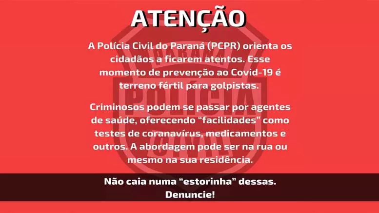 Criminosos podem usar a pandemia de coronavírus para aplicar golpes. O alerta é da Polícia Civil do Paraná, divulgado nesta quinta-feira (19). Segundo a Polícia, o momento de prevenção ao Covid-19 é terreno fértil para […]