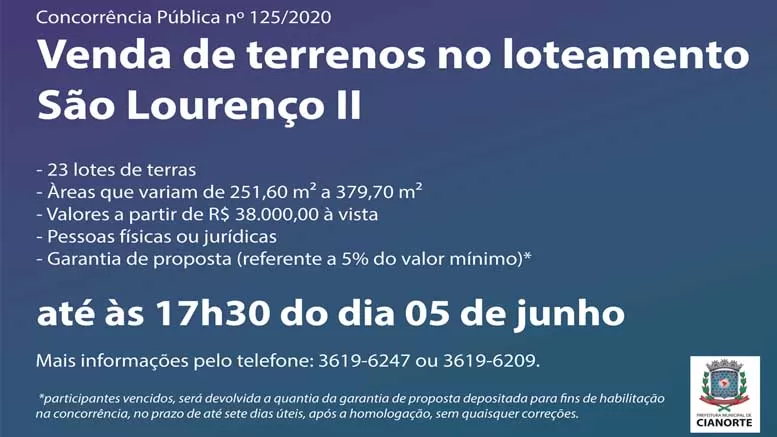 Prefeitura anuncia a venda de terrenos no loteamento São Lourenço II