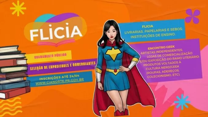 A Secretaria Municipal de Cultura de Cianorte abriu o credenciamento de expositores e comerciantes interessados em participar da 8ª edição da Festa Literária de Cianorte – FLICIA. O chamamento contempla dois eventos da programação: a Semana Cult, de 22 a 25 de maio, e o 3º Encontro Geek, no dia 25 de maio, ambos na Praça da República.