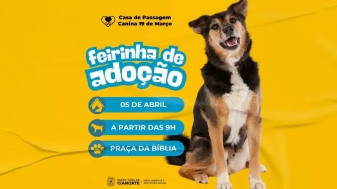 Neste sábado (05), a partir das 9h, a Praça da Bíblia, em Cianorte, recebe mais uma edição da Feirinha de Adoção da Casa de Passagem Canina 19 de Março (Canil Municipal). A ação tem como objetivo promover a adoção responsável e encontrar lares amorosos para cães adultos e filhotes.