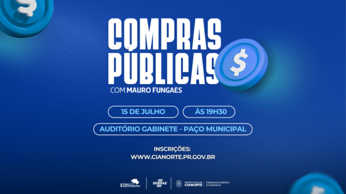 Empreendedores de Cianorte têm poucos dias para garantir vaga na oficina gratuita sobre Compras Públicas, que acontece na próxima terça-feira (15), às 19h30, no auditório do Paço Municipal. A capacitação, promovida pela Prefeitura de Cianorte, por meio da Casa do Empreendedor, em parceria com o Sebrae, será ministrada pelo especialista Mauro Fungaes.