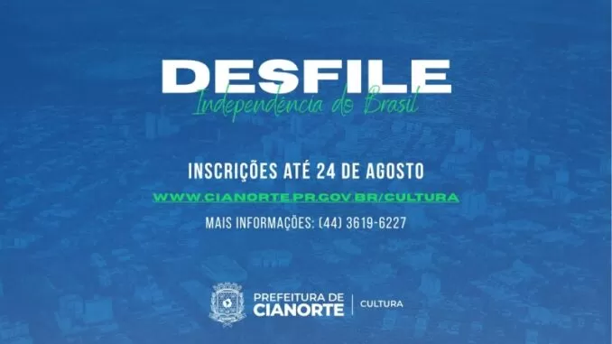 A Prefeitura de Cianorte, por meio da Secretaria Municipal de Cultura, está com inscrições abertas para o tradicional Desfile Cívico-Militar em comemoração à Independência do Brasil. O evento acontece no dia 7 de setembro e promete reunir escolas, clubes, associações e diversos grupos da cidade.