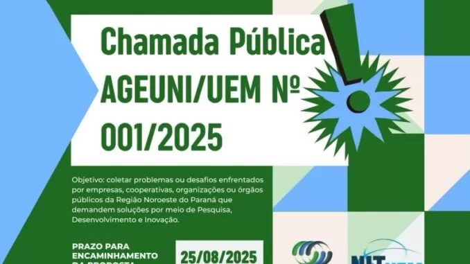 A Universidade Estadual de Maringá (UEM), por meio da Agência de Desenvolvimento Regional Sustentável e Inovação (AGEUNI), abriu inscrições para a Chamada Pública Nº 001/2025, que busca identificar desafios e problemas enfrentados por empresas, cooperativas, organizações e órgãos públicos da Região Noroeste do Paraná.