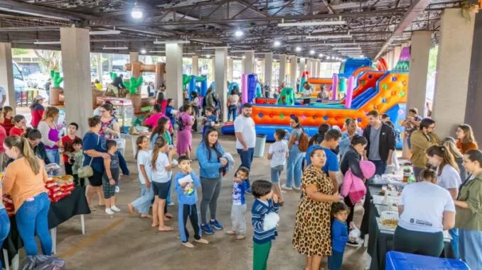 Evento promovido na Feira do Produtor teve brinquedos infláveis, guloseimas e atividades para crianças dos CRAS, CREAS e CERTEA