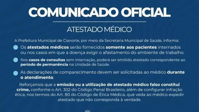 A Secretaria Municipal de Saúde de Cianorte passou a adotar novos critérios para a emissão de atestados médicos, em conformidade com a Recomendação Normativa nº 01/2025 do Conselho Regional de Medicina do Paraná (CRM-PR). Agora, os atestados só serão emitidos em casos de internação ou quando houver justificativa clínica para afastamento das atividades laborais.