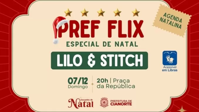 A magia do Natal tomará conta da Praça da República neste domingo (7), a partir das 20h, com mais uma edição da Pref Flix Especial de Natal. O evento gratuito, promovido pela Prefeitura de Cianorte como parte da programação dos Encantos de Natal 2025, traz ao público a animação “Lilo & Stitch”, em sua versão mais recente, lançada em 2025.