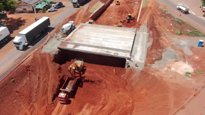 As etapas principais da construção, como bases, pilares e tabuleiro, já foram finalizadas. Agora, as equipes trabalham na implantação das lajes de transferência, que vão conectar o viaduto às vias marginais da rodovia. Na parte inferior, seguem os serviços de terraplenagem, rebaixamento da pista central da PR-445, nova pavimentação e implantação do sistema de drenagem.