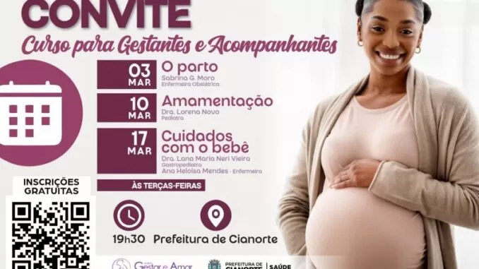 As inscrições para a primeira edição de 2026 do curso gratuito Gestar e Amar, voltado a gestantes e acompanhantes, estão na reta final. A formação começa na próxima terça-feira (03/03), às 19h30, no auditório da Prefeitura, e as vagas são limitadas à capacidade do espaço.