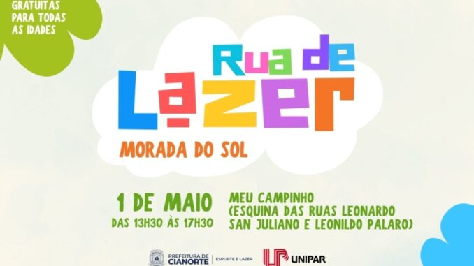 O feriado do Dia do Trabalhador terá programação especial para as famílias em Cianorte. Nesta sexta-feira, 1º de maio, o Meu Campinho Morada do Sol recebe mais uma edição da Rua de Lazer, com atividades gratuitas para crianças e a comunidade.